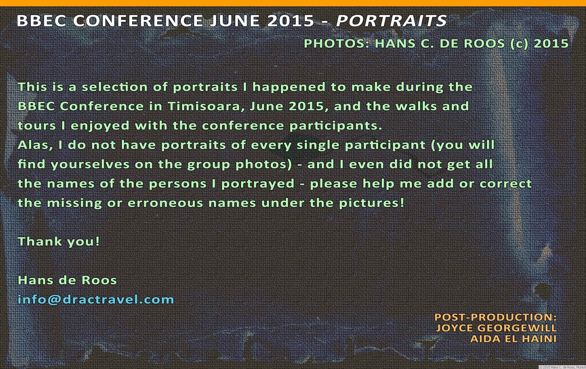 About the portraits - Please help completing the names! Marius Crisan (Romania), our host and guide :-) Geraldine Morris (UK) and Aislynn Collier (Utah, US) Bianca Briceag and Arianna Giuliani (Italy) Sila Durhan (Turkey) Kevin Collier (Utah, US) Sam George and Bill Highes (UK) Maria and Nuria Alcantud Diaz (Spain) Zuzana Podracka (UK/Slovakia) and Roger Davis (Canada) Dorota Babila and her husband (Poland) Duncan Light (UK) and Kristin Bone (California, US) Brad Bushman (Ohio, US) Ruzena Simonji Cernak, Serbia Craig Anderson (Iowa, US) Aislynn and Kevin Collier (US) These are names I missed as well :-( Roza Valeeva (Kazan)? Or Gulfia Parfilova? Roza and Gulfia (Or Gulfia and Roza?) Ooops! What was your name again? Marta Fulop and her family (?) (Hungary) Nuria and Angel Alcantud Diaz Iulia Mancila (Romania/Spain) Bill photographing his beer Kristin Bone (California, US) Kaja Franck (UK) and Magdalena Grabias (Poland) Kaja Franck (UK) Bill Hughes (The Bath Spa Bill) (UK) Nancy Schumann (UK) and her companion Nuria and Maria Alcantud Diaz Madalina, of the Pizzeria Roma in Hunedora Duncan Light (UK) and Silvia Burciu Sofia Damse (Romania/France) Wedding couple at Hunedora castle Sofia Damse (Romania/France) Magdalena Grabias (Poland) Kaja Franck (UK) Ionuta-Natalia Munteanu Iorgas (Romania) Zuzana Prodacka (UK/Slovakia) and Ignasi Sols Balcells (Spain) Marius Crisan and Donatella (Adele) Badin Young girl at the Alba Iulia Citadel