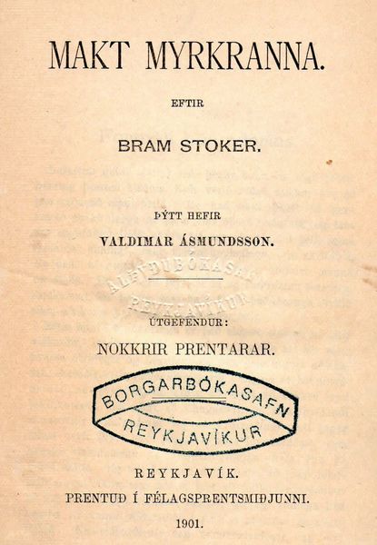 Bram Stoker's Preface to the Icelandic edition![]() Title page of the 1901 Icelandic edition The reader of this story will very soon understand how the events outlined in these pages have been gradually drawn together to make a logical whole. Apart from excising minor details which I considered unnecessary, I have let the people involved relate their experiences in their own way; but, for obvious reasons, I have changed the names of the people and places concerned. In all other respects I leave the manuscript unaltered, in deference to the wishes of those who have considered it their duty to present it before the eyes of the public. I am quite convinced that there is no doubt whatever that the events here described really took place, however unbelievable and incomprehensible they might appear at first sight. And I am further convinced that they must always remain to some extent incomprehensible, although continuing research in psychology and natural sciences may, in years to come, give logical explanations of such strange happenings which, at present, neither scientists nor the secret police can understand. I state again that this mysterious tragedy which is here described is completely true in all its external respects, though naturally I have reached a different conclusion on certain points than those involved in the story. But the events are incontrovertible, and so many people know of them that they cannot be denied. This series of crimes has not yet passed from the memory -- a serious of crimes which appear to have originated from the same source, and which at the same time created as much repugnance in people everywhere as the murders of Jack the Ripper, which came into the story a little later. Various people’s minds will go back to the remarkable group of foreigners who for many seasons together played a dazzling part in the life of the aristocracy here in London; and some will remember that one of them disappeared suddenly without apparent reason, leaving no trace. All the people who have willingly -- or unwillingly -- played a part in this remarkable story are known generally and well respected. Both Jonathan Harker and his wife (who is a woman of character) and Dr. Seward are my friends and have been so for many years, and I have never doubted that they were telling the truth; and the highly respected scientist, who appears here under a pseudonym, will also be too famous all over the educated world for his real name, which I have not desired to specify, to be hidden from people -- least of all those who have from experience learnt to value and respect his genius and accomplishments, though they adhere to his views on life no more than I. But in our times it ought to be clear to all serious-thinking men that “there are more things in heaven and earth London, |